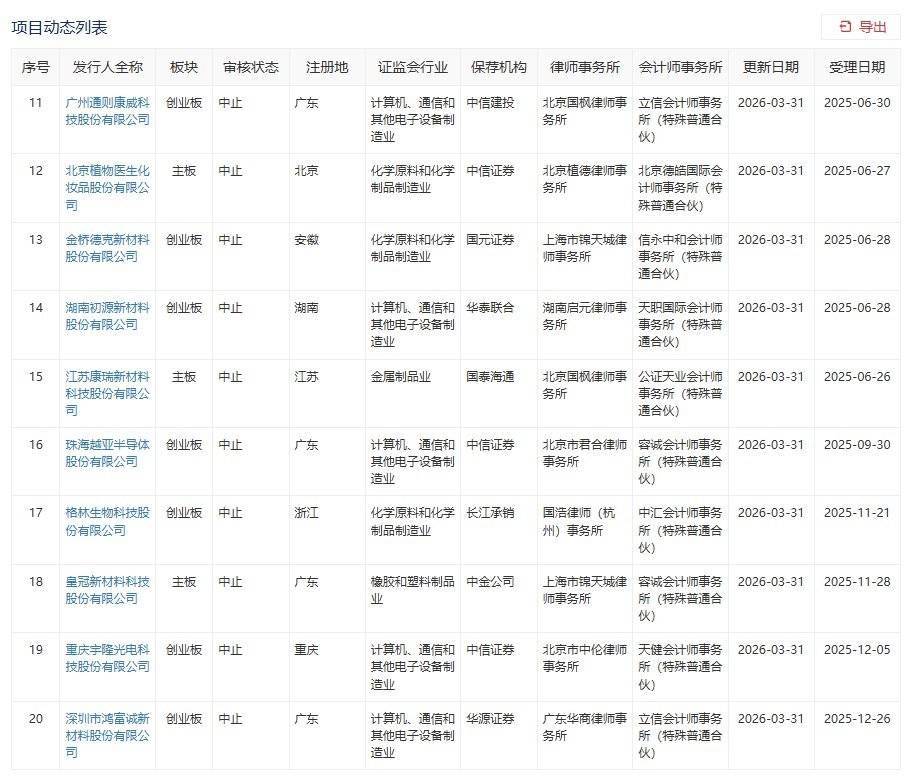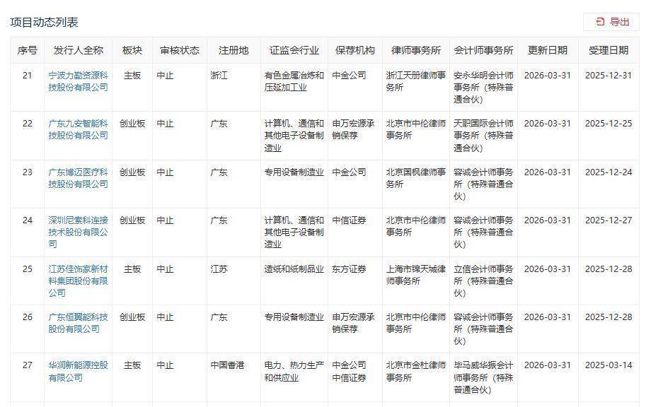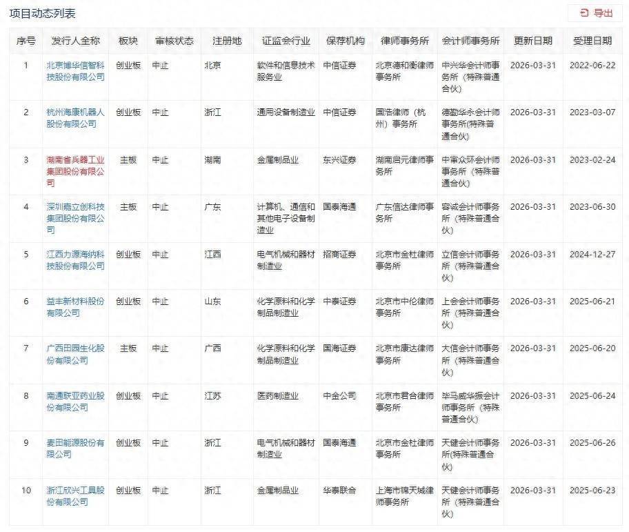 智通财经APP获悉,深交所官网显示,3月31日,博华科技、海康机器、湖南兵器等共计27家企业IPO审核状态更新为“中止”。